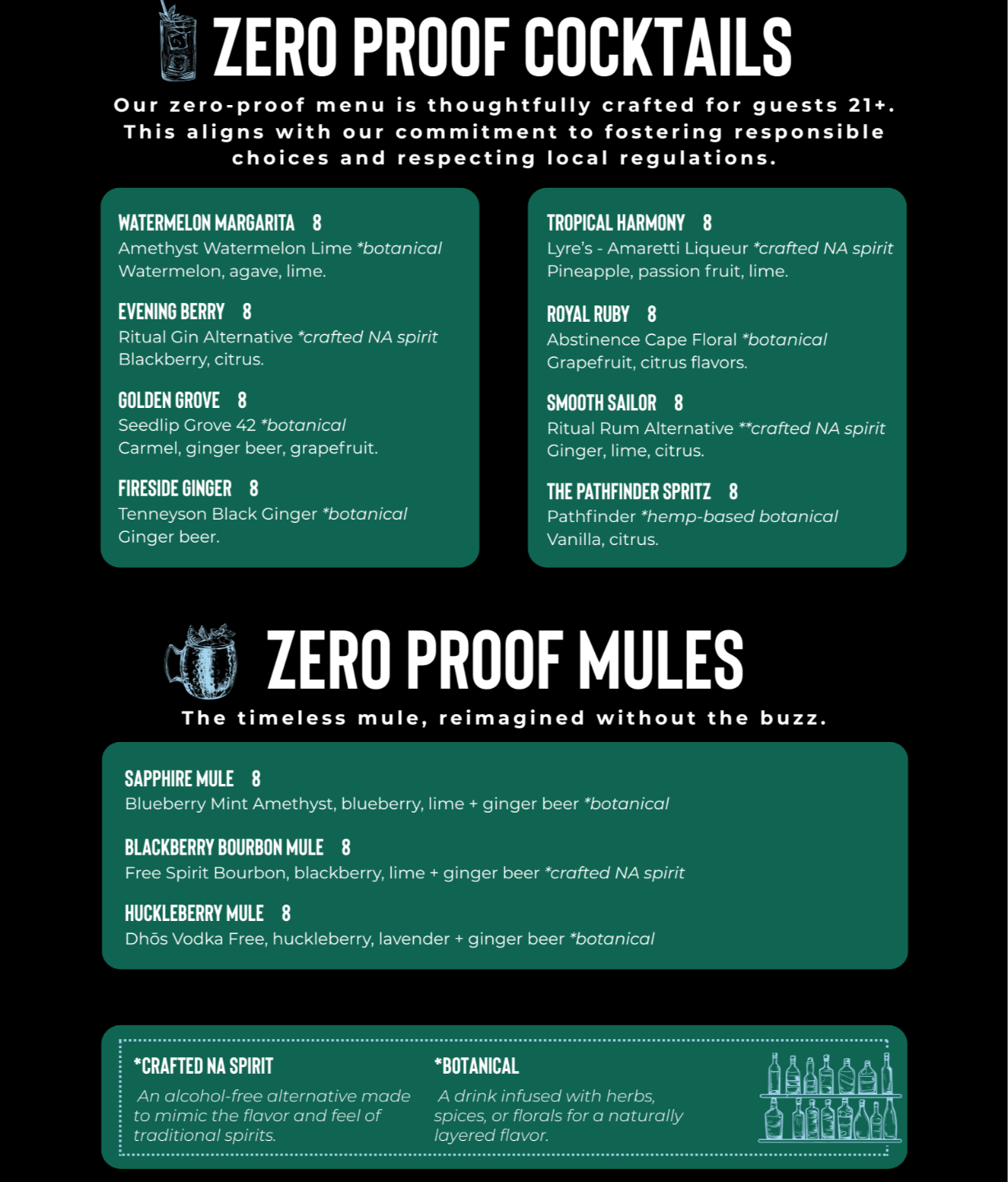 Whether you're sober, sober-curious, pregnant, an athlete, prioritizing your well-being or mental health, or simply want to avoid a hangover, this zero-proof lounge is for you. Everyone is welcome here!